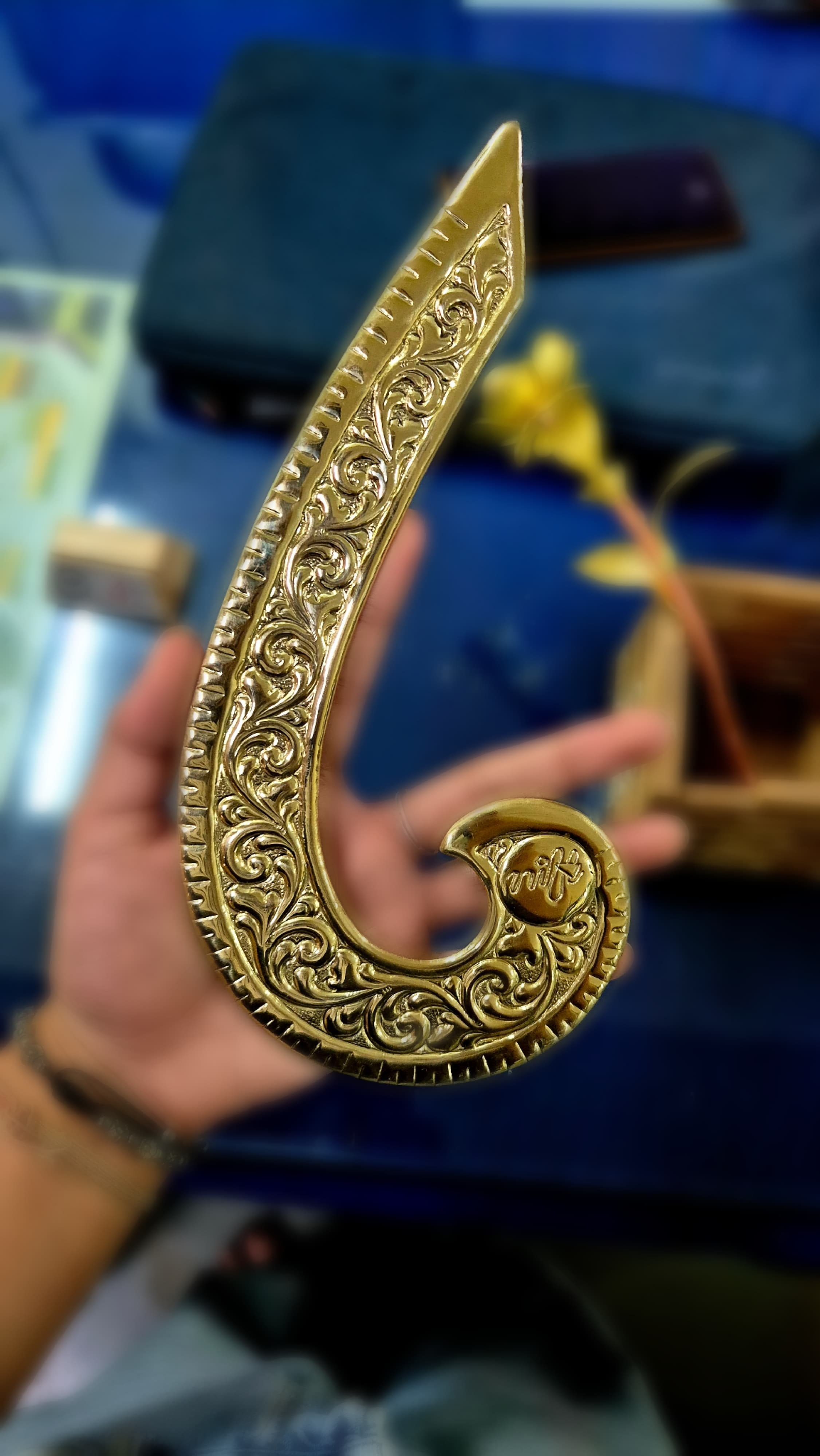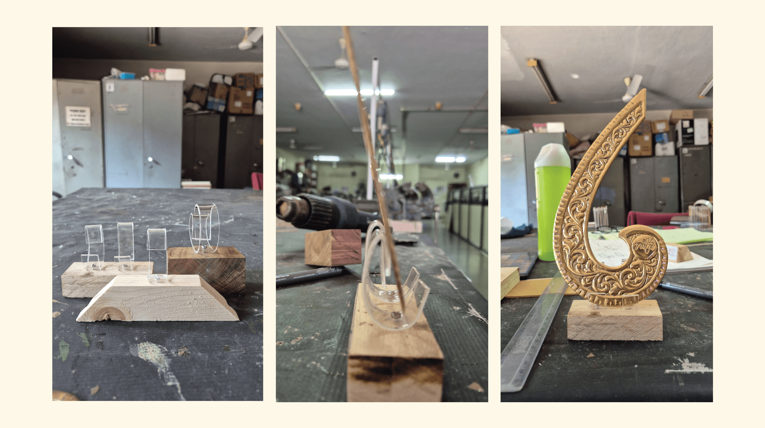 The memento centers around a French curve scale, an iconic and essential tool used by designers. The French curve crafted in brass, drawing inspiration from the intricate motifs and ornamental detailing of Pembarthi metalwork, known for its storytelling and craftsmanship.